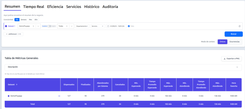 | Únicos | Cuenta cada tiquete una sola vez, independientemente de cuántos estados haya pasado | Cuando necesita saber el número real de clientes atendidos |