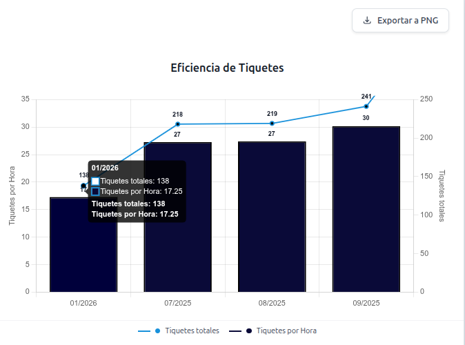 Esta gráfica muestra qué tan productivos son sus agentes. Las barras le dicen cuántos clientes atiende cada agente por hora, y la línea muestra el total de clientes atendidos en cada período. Le ayuda a ver si la productividad está mejorando o empeorando con el tiempo.