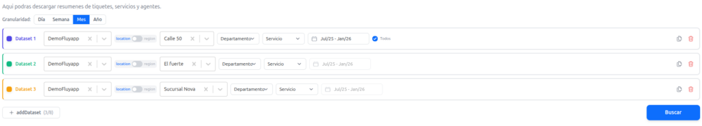 El sistema de comparación permite crear múltiples «grupos de datos» para analizar y contrastar información de diferentes ubicaciones, períodos o configuraciones en las mismas visualizaciones. Cada grupo se identifica con un color único.